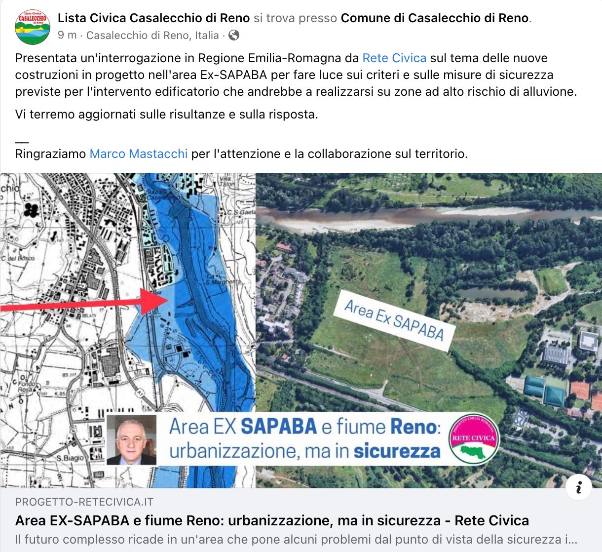 AREA ex-SAPABA e fiume RENO: presentata un’interrogazione in Regione Emilia-Romagna(in collaborazione con Rete Civica e Marco Mastacchi) sul tema delle nuove costruzioni in progetto nell’area Ex-SAPABA per fare luce sui criteri e sulle misure di sicurezza previste per l’intervento edificatorio che andrebbe a realizzarsi su zone ad alto rischio di alluvione.
